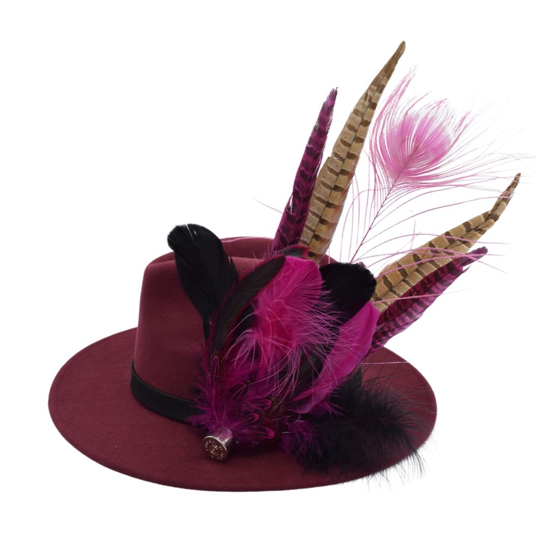 Each hat comes with a unique feather decoration. Our images represent the general look of our feathers. However, each feather decoration is individually handmade, but will be similar in design to our photography. The Arielle Maroon Fedora Hat comes with feathers featuring the colours cerise, navy and brown, with a signature tail feather.