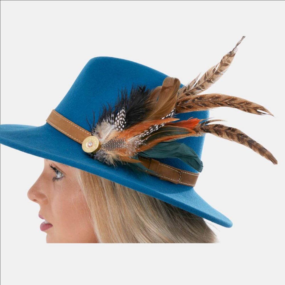 Our Daisy Teal Fedora Hat with Feathers comes in a beautiful teal colour with contrasting feathers. Our hats are made in 100% Wool which has crushable qualities for it will regain its shape quickly if squashed. Our Fedora Hats have a Teflon coating. A Teflon Coating will make them weather resistant but not totally waterproof. The hat brim measures 7cm and is detailed with a leather hat belt and a unique feather.