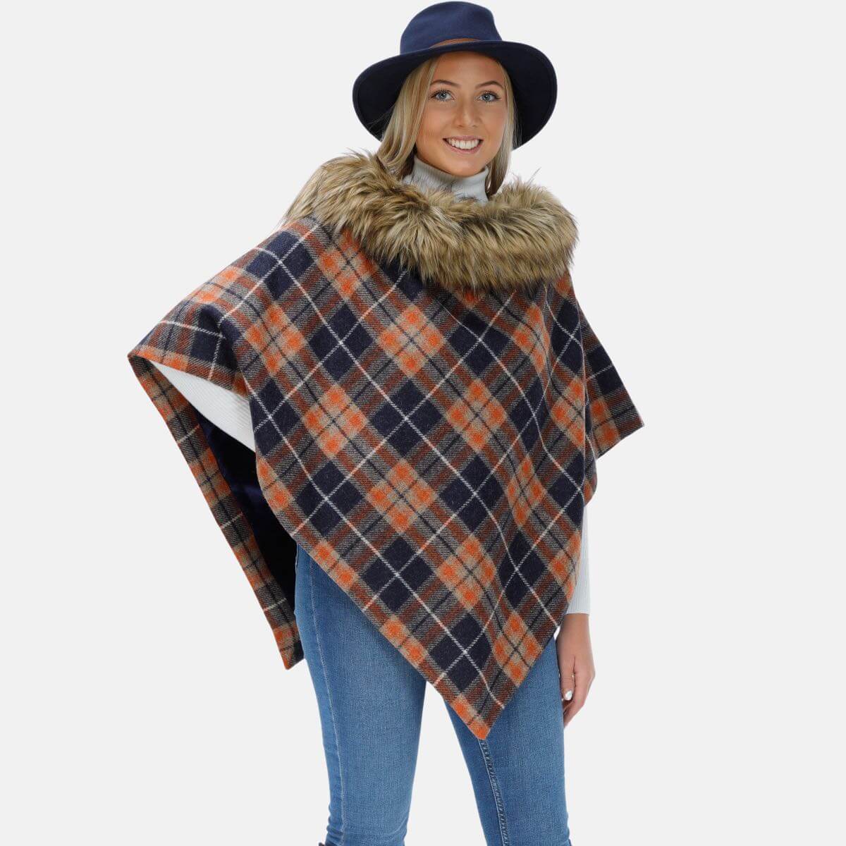 The Elana Regular Length Tweed and Faux-Fur Collar Cape brings a new tweed design for Autumn Winter 2022. Produced in 100% Pure New English Wool, the Cape comes in a vibrant Navy, Orange, Biscuit and Seafoam check. This classic style has been designed around the same base pattern as our Tweed Collar Cape version. Just perfect for the cold Autumn and Winter evenings when going out or just simply during the day. The Regular Tweed and Faux-Fur Collar Cape is perfect for any occasion. The Faux-Fur comes in a contrast natural colour.