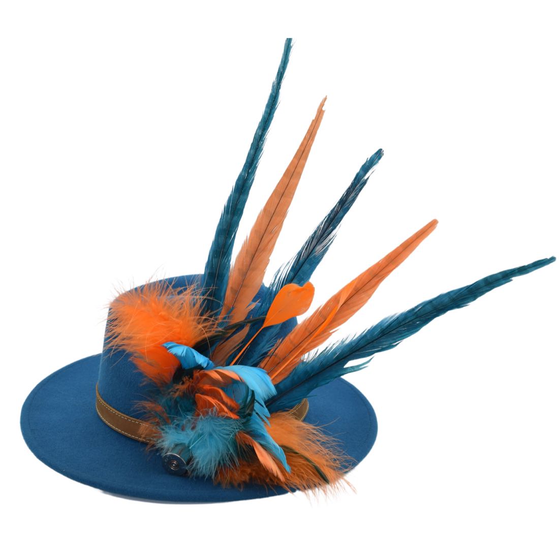 Each hat comes with a unique feather decoration. Our images represent the general look of our feathers. However, each feather decoration is individually handmade, but will be similar in design to our photography. The Elisa Green Fedora Hat comes with feathers featuring the colours blue, brown and rust, with a signature tail feather.