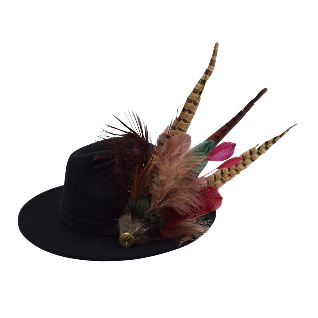 Each hat comes with a unique feather decoration. Our images represent the general look of our feathers. However, each feather decoration is individually handmade, but will be similar in design to our photography. The Ella Mustard Fedora Hat comes with feathers featuring the colours brown, green and wine, with a signature tail feather.