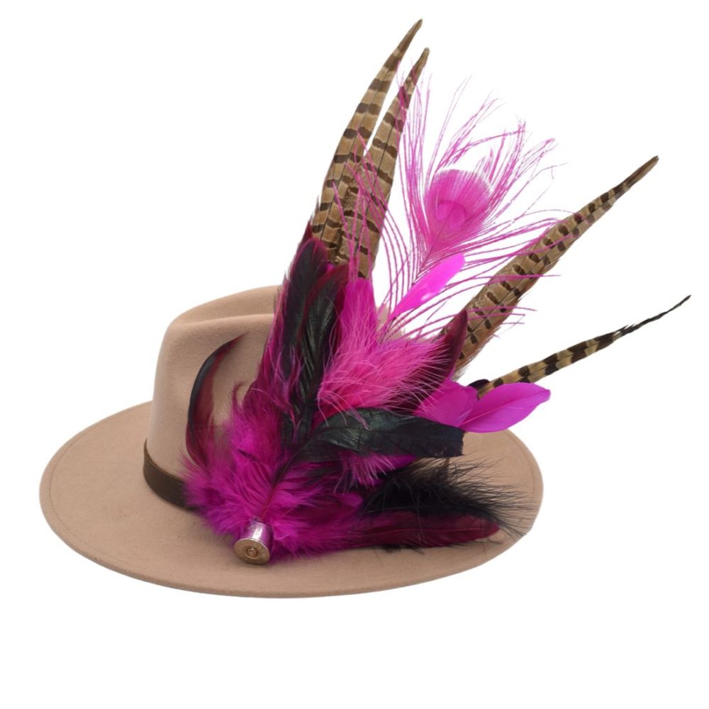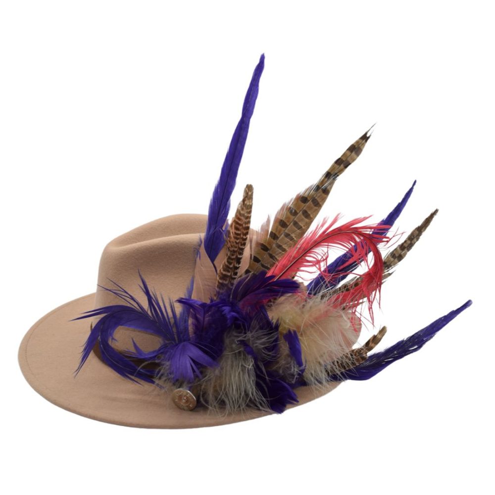Each hat comes with a unique feather decoration. Our images represent the general look of our feathers. However, each feather decoration is individually handmade, but will be similar in design to our photography. The Elyse Beige Fedora Hat comes with feathers featuring the colours black and brown, with a signature tail feather.
