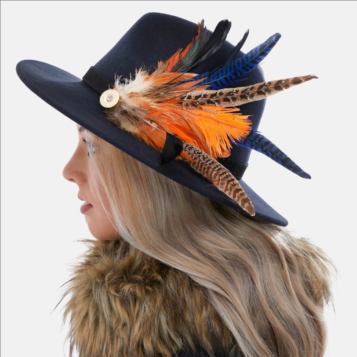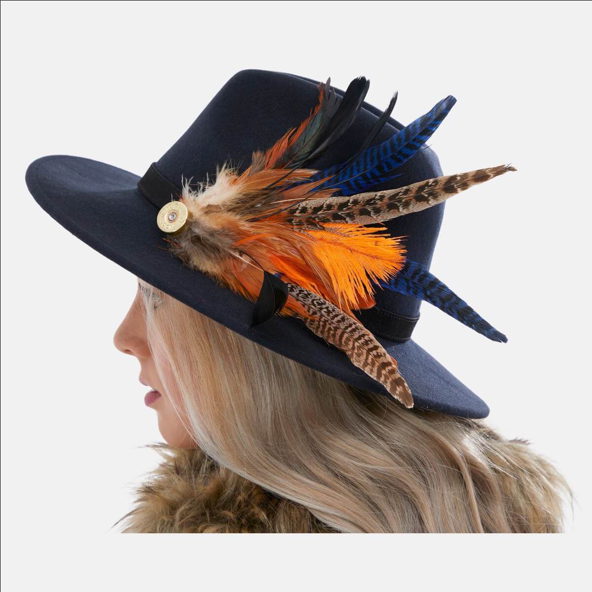 Each hat comes with a unique feather decoration. Our images represent the general look of our feathers. However, each feather decoration is individually handmade, but will be similar in design to our photography. The Emma Navy Fedora Hat comes with feathers featuring the colours black, navy and brown.