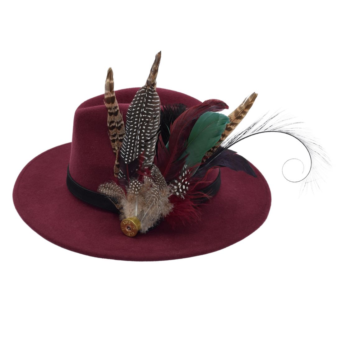 Our Evelyn Maroon Fedora Hat with Feathers comes in a traditional countryside Maroon colour with contrasting feathers. Each Grace and Dotty high quality Fedora Hat is made in 100% Wool. The Fedora Hats have crushable qualities and it will regain its shape quickly if squashed. Our Fedora Hats have a Teflon coating. A Teflon Coating will make them weather resistant but not totally waterproof. The Fedora Hat brim measures 7cm and is detailed with a leather hat belt and a unique feather.