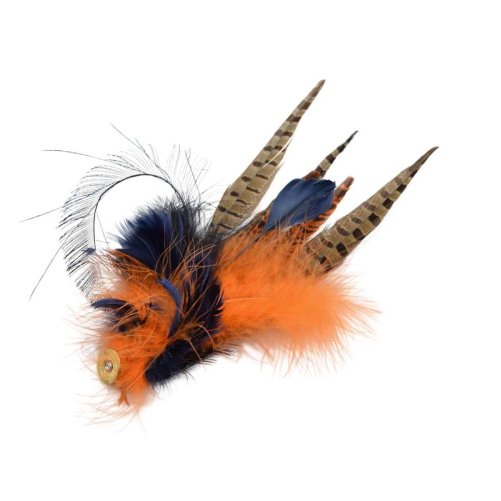This Feather Brooch comes in a premium array of fine feathers. Using a beautiful combination of brown, navy and orange feathers with our signature Feather.