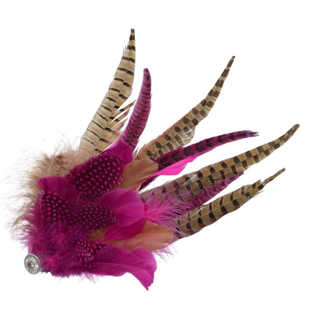 The Zaria Feather comes in a premium array of fine feathers. Using a beautiful combination of brown, purple, cerise and pink feathers with our signature Feather, the Handmade Zaria Feather Brooch is a head turner.