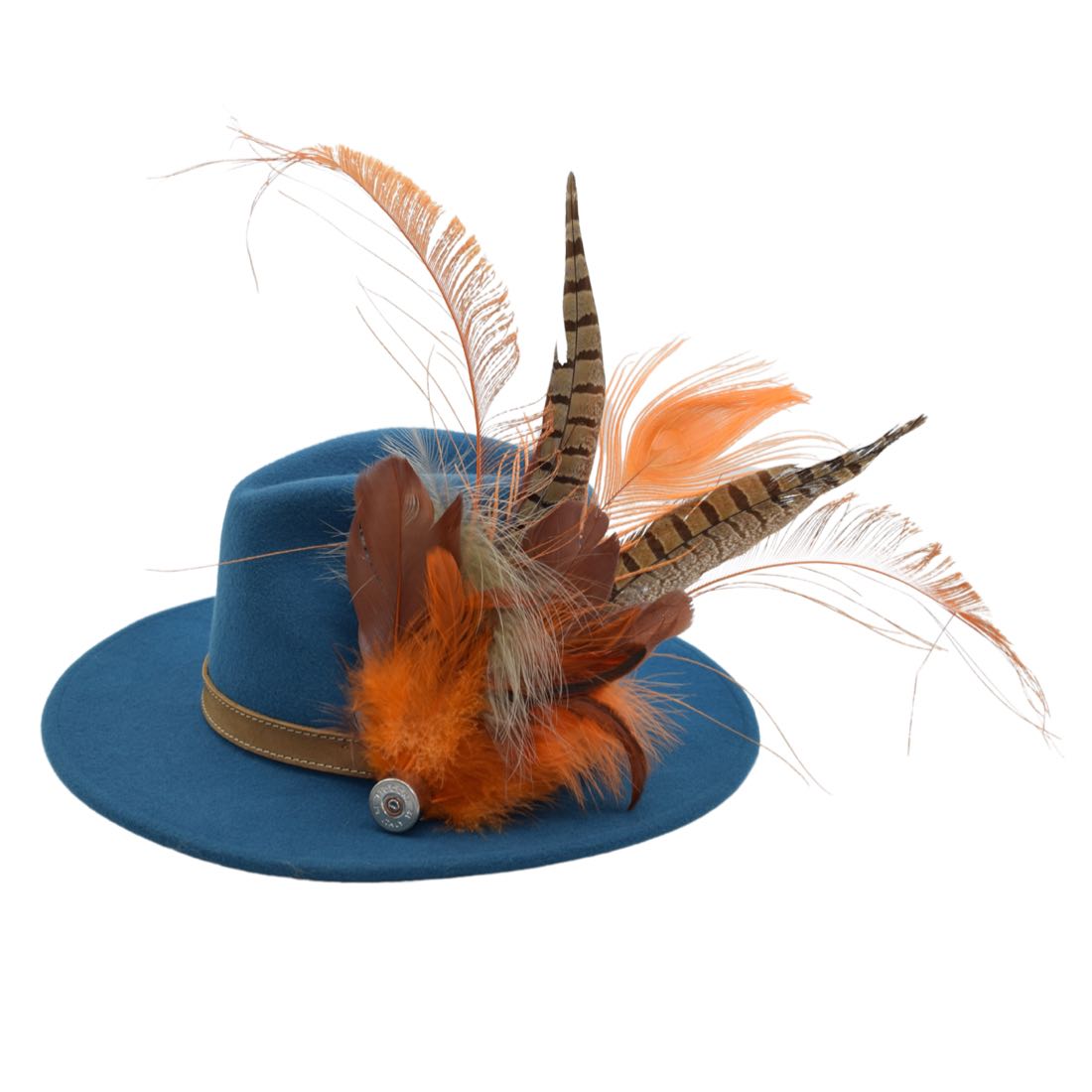 Each hat comes with a unique feather decoration. Our images represent the general look of our feathers. However, each feather decoration is individually handmade, but will be similar in design to our photography. The Harper Teal Fedora Hat comes with feathers featuring the colours turquoise, black, blue, and brown, with a signature tail feather.