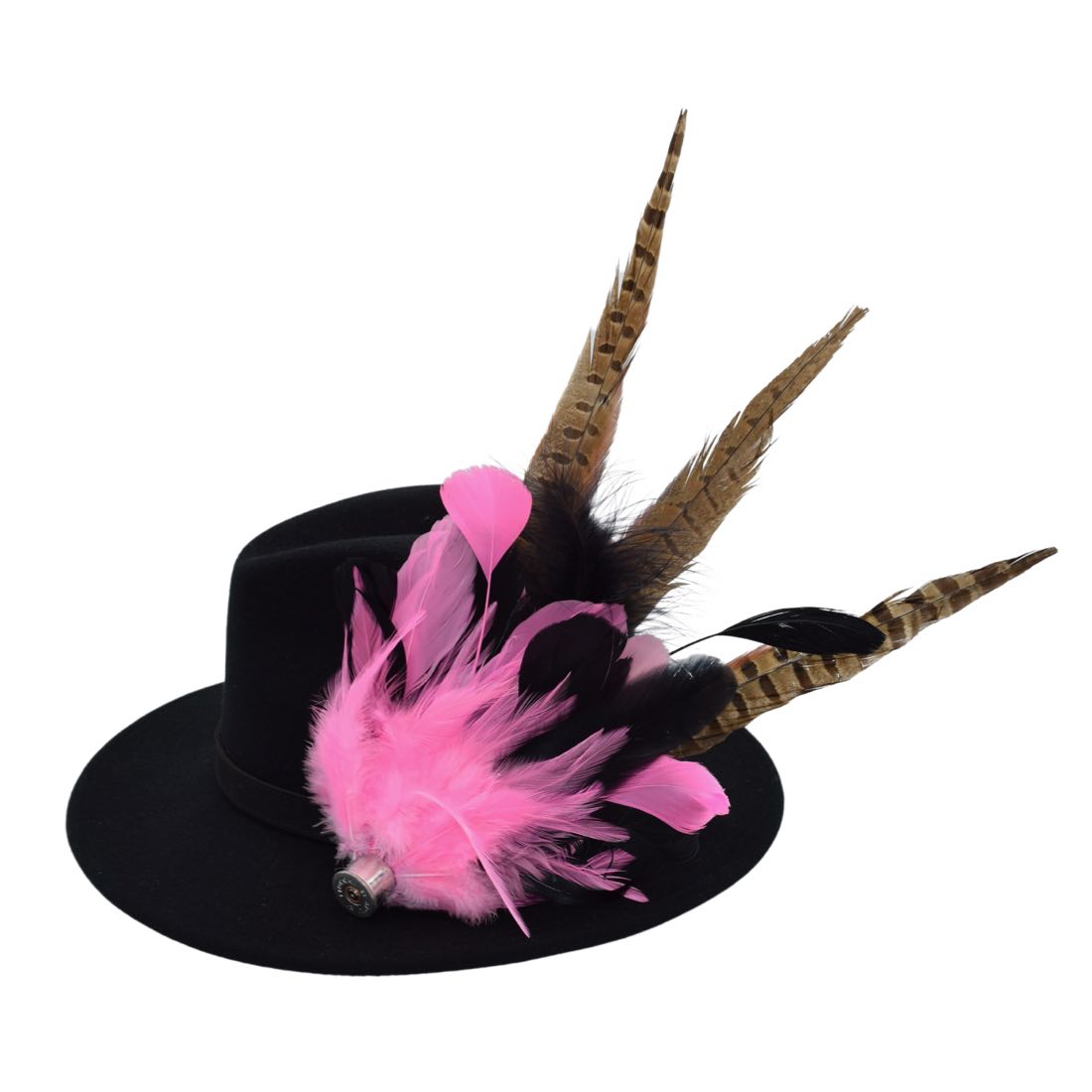 Each hat comes with a unique feather decoration. Our images represent the general look of our feathers. However, each feather decoration is individually handmade, but will be similar in design to our photography. The Isabelle Black Fedora Hat comes with feathers featuring the colours aqua, black, blue and brown, with a signature tail feather.