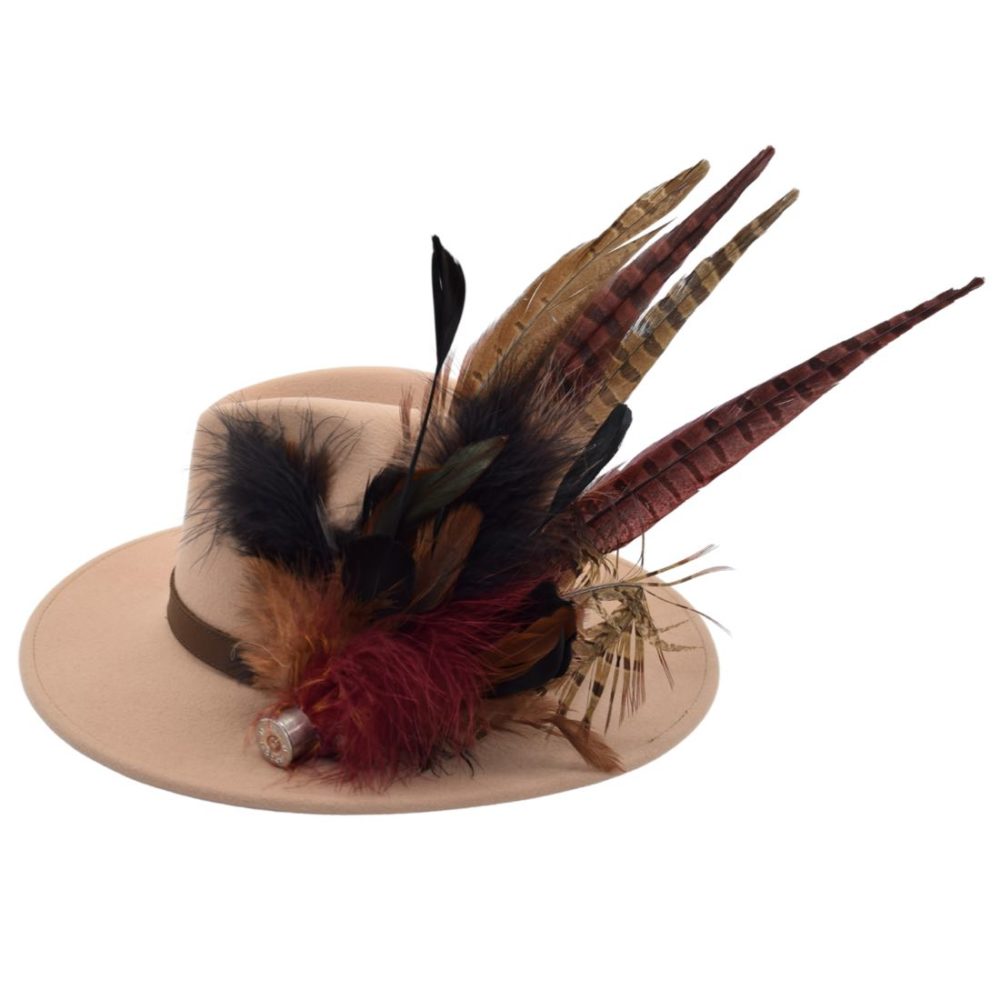 Each hat comes with a unique feather decoration. Our images represent the general look of our feathers. However, each feather decoration is individually handmade, but will be similar in design to our photography. The Jordan Beige Fedora Hat comes with feathers featuring the colours black, brown, and pink, with a signature tail feather.