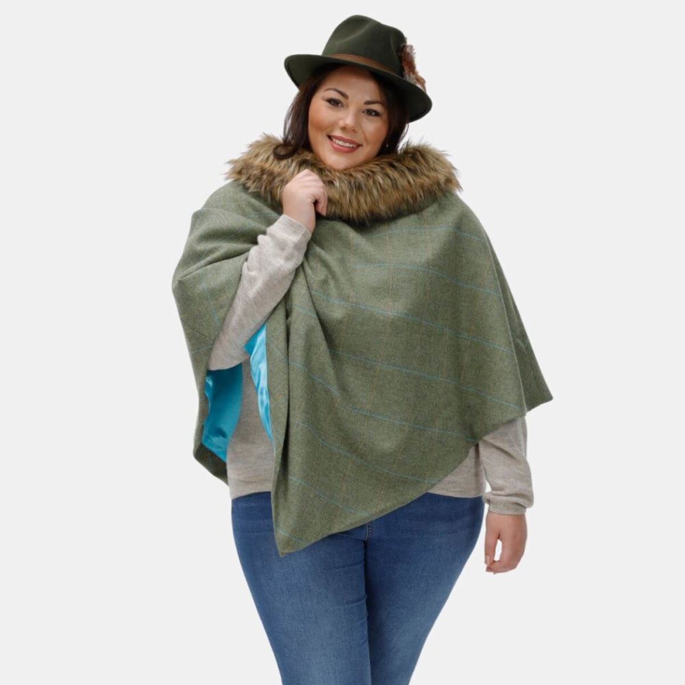 The Karen Curvy Cape Tweed and Faux-Fur Collar Cape is fully lined in turquoise colour satin and flows beautifully when it is being worn. The collar sits gently across the shoulders and has similar deeper Faux-Fur to our regular cape. Available in all of our continuity tweeds the Curvy Cape is becoming established as a firm customer favourite.