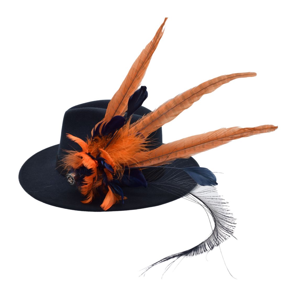 Each hat comes with a unique feather decoration. Our images represent the general look of our feathers. However, each feather decoration is individually handmade, but will be similar in design to our photography. The Karla Navy Fedora Hat comes with feathers featuring the colours wine, black, brown and navy, with a signature tail feather.