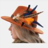 Each hat comes with a unique feather decoration. Our images represent the general look of our feathers. However, each feather decoration is individually handmade, but will be similar in design to our photography. The Lara Rust Fedora Hat comes with feathers featuring the colours orange, blue and brown.