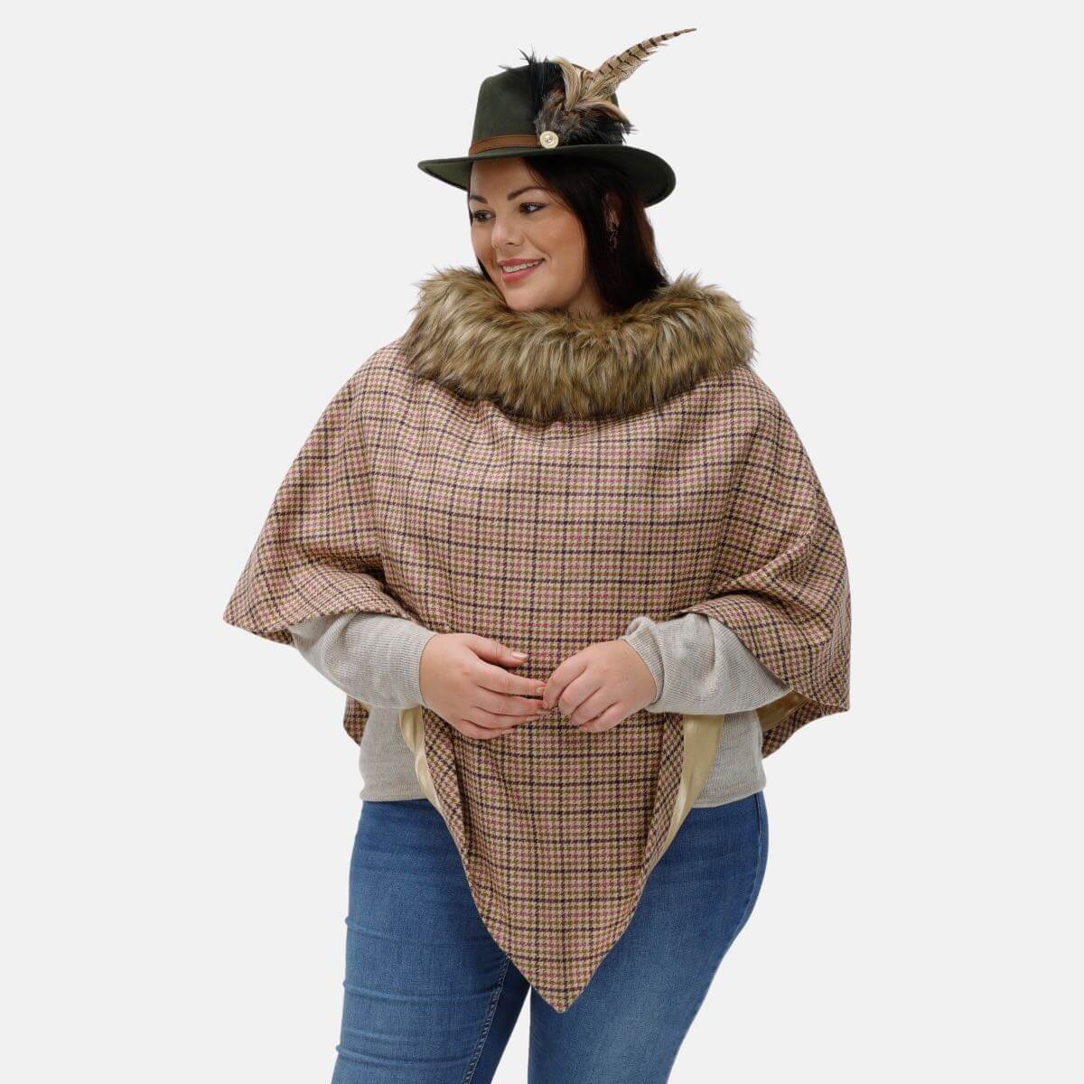 The Leah Curvy Cape Tweed and Faux-Fur Collar Cape is new style of Cape produced for 2022. This product is perfect for our customers who are blessed with Curves. Ideally suited to customers who are body sized 18/20 to 24/26. Produced in 100% Pure New English Wool, the Cape is in a dark seafoam colour with an Aubergine, light Purple and Olive dogstooth check and our signature natural faux-fur. This exciting style has been designed around a similar shape to our Regular Faux-Fur Cape version with a number of amendments. Just perfect for the cold Autumn and Winter evenings when going out or just simply during the day. The Curvy Tweed and Faux-Fur Collar Cape is perfect for any occasion, whether formal or informal.