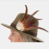 Our Lexie Sage Fedora Hat with Feathers comes in a beautiful sage colour with contrasting feathers. Our hats are made in 100% Wool which has crushable qualities for it will regain its shape quickly if squashed. Our Fedora Hats have a Teflon coating. A Teflon Coating will make them weather resistant but not totally waterproof. The hat brim measures 7cm and is detailed with a leather hat belt and a unique feather.