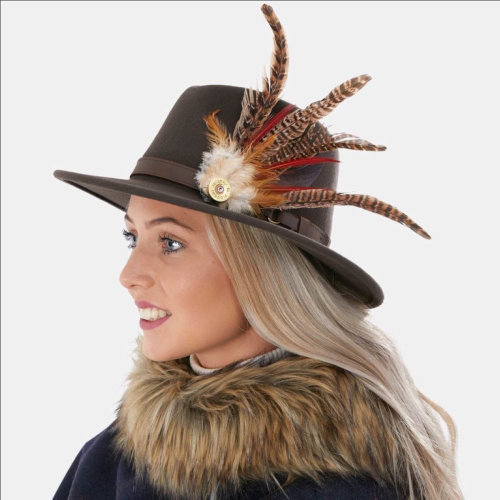 Our Linda Brown Fedora Hat with Feathers comes in a beautiful brown colour with contrasting feathers. Our hats are made in 100% Wool which has crushable qualities for it will regain its shape quickly if squashed. Our Fedora Hats have a Teflon coating. A Teflon Coating will make them weather resistant but not totally waterproof. The hat brim measures 7cm and is detailed with a leather hat belt and a unique feather.