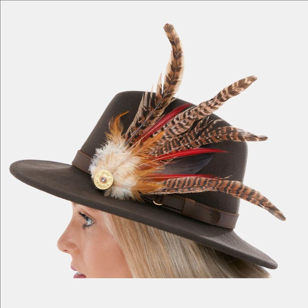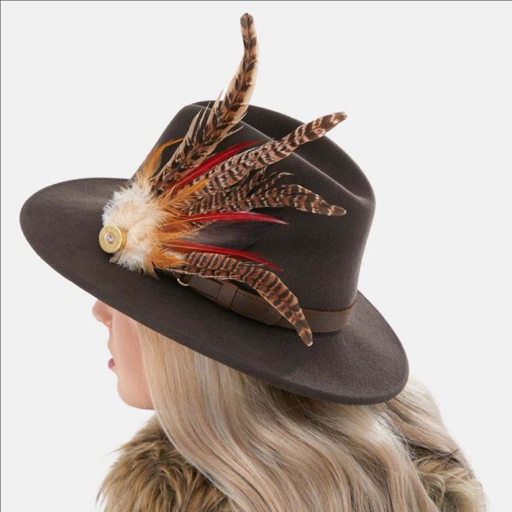 Each hat comes with a unique feather decoration. Our images represent the general look of our feathers. However, each feather decoration is individually handmade, but will be similar in design to our photography. The Linda Brown Fedora Hat comes with feathers featuring the colours orange, cream, red and brown.