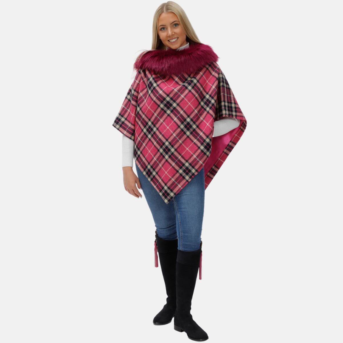 The Marlee Regular Length Tweed and Faux-Fur Collar Cape brings a new tweed design for Autumn Winter 2022. Produced in 100% Pure New English Wool, the Cape comes in a vibrant Pink, Navy and Seafoam check. This classic style has been designed around the same base pattern as our Tweed Collar Cape version. Just perfect for the cold Autumn and Winter evenings when going out or just simply during the day. The Regular Tweed and Faux-Fur Collar Cape is perfect for any occasion. The Faux-Fur comes in a contrast vibrant pink colour.