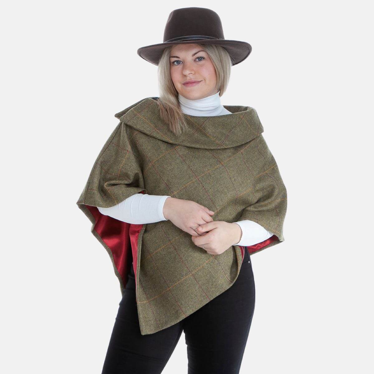 The Megan Tweed Collar Short Capes were launched in spring 2019, and were a new addition to our collection. The Capes have been designed, developed and made in the beautiful Vales of Belvoir, England. Produced in our Megan Tweed, this beautiful garment comes in an olive base with a gold and cranberry Check colour. All of our products are hand finished by our team of seamstresses with love and care.