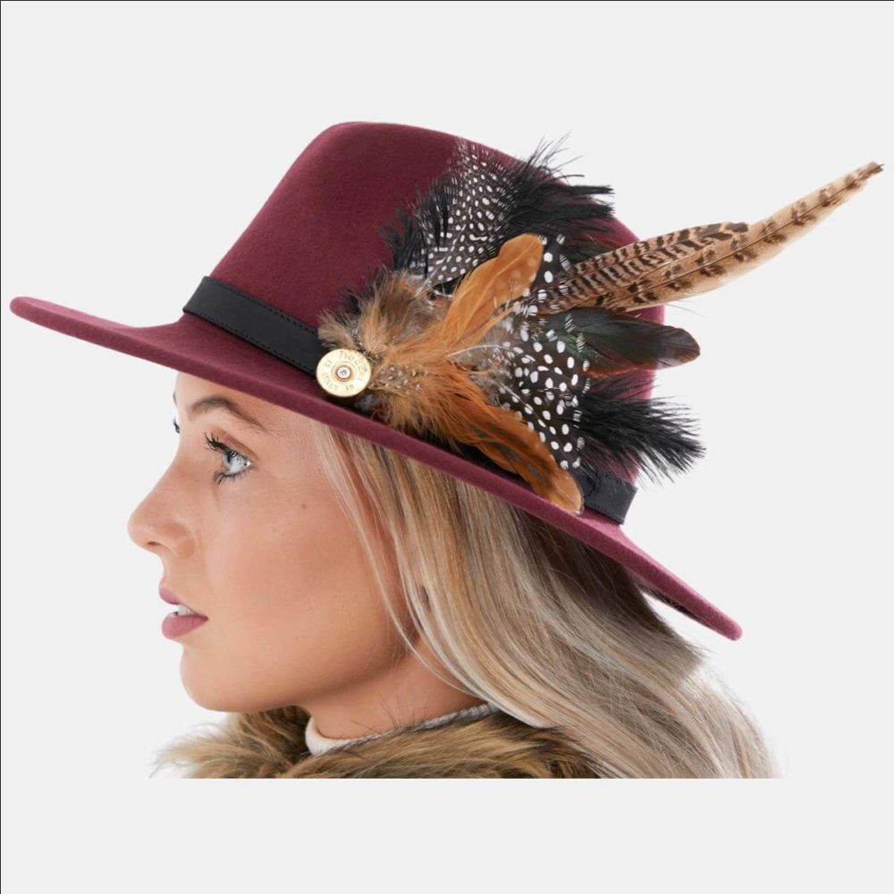 Each hat comes with a unique feather decoration. Our images represent the general look of our feathers. However, each feather decoration is individually handmade, but will be similar in design to our photography. The Remy Maroon Fedora Hat comes with feathers featuring the colours wine, green and brown.