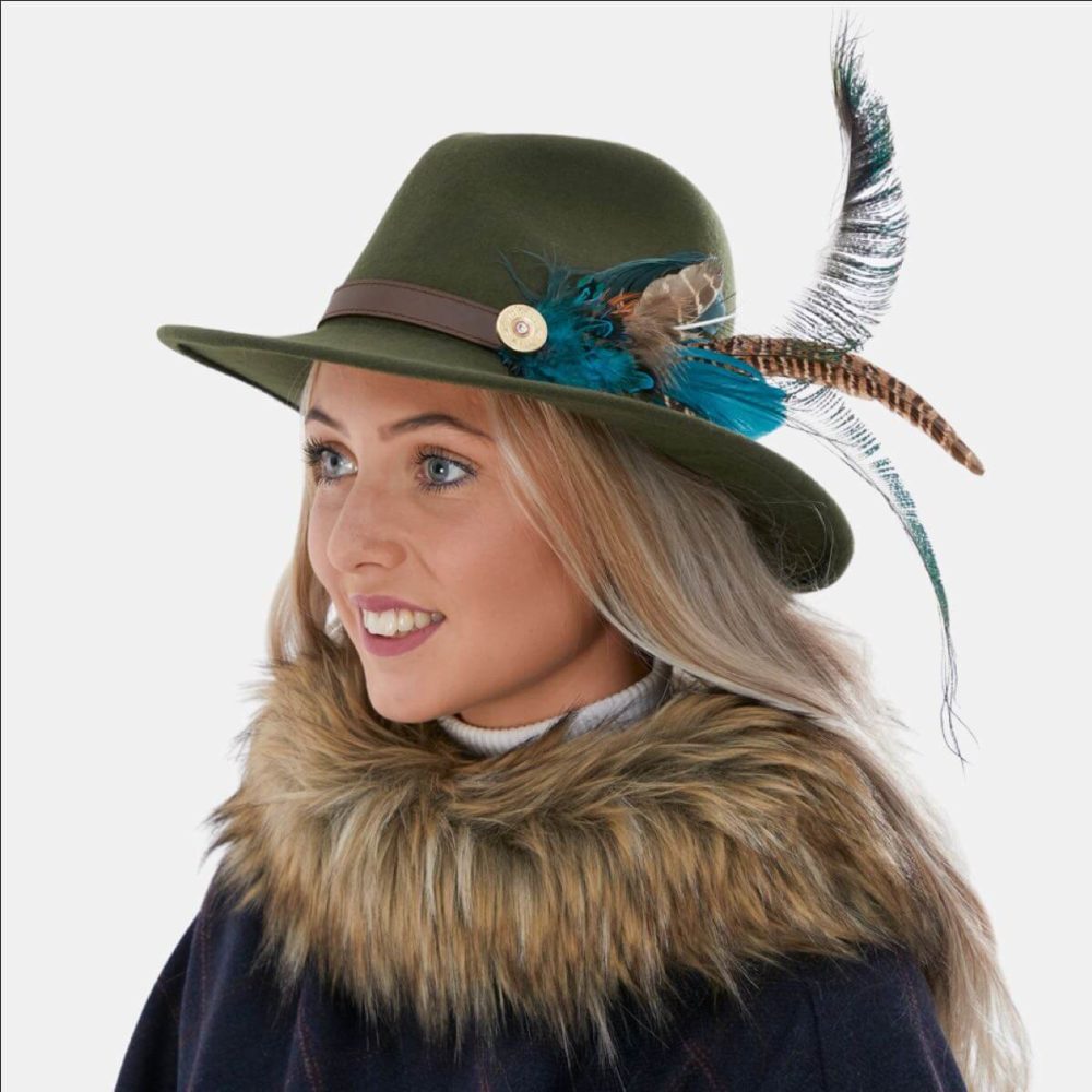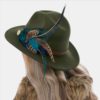 Our Sadie Green Fedora Hat with Feathers comes in a beautiful green colour with contrasting feathers. Our hats are made in 100% Wool which has crushable qualities for it will regain its shape quickly if squashed. Our Fedora Hats have a Teflon coating. A Teflon Coating will make them weather resistant but not totally waterproof. The hat brim measures 7cm and is detailed with a leather hat belt and a unique feather.