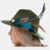 Each hat comes with a unique feather decoration. Our images represent the general look of our feathers. However, each feather decoration is individually handmade, but will be similar in design to our photography. The Sadie Green Fedora Hat comes with feathers featuring the colours turquoise and brown.